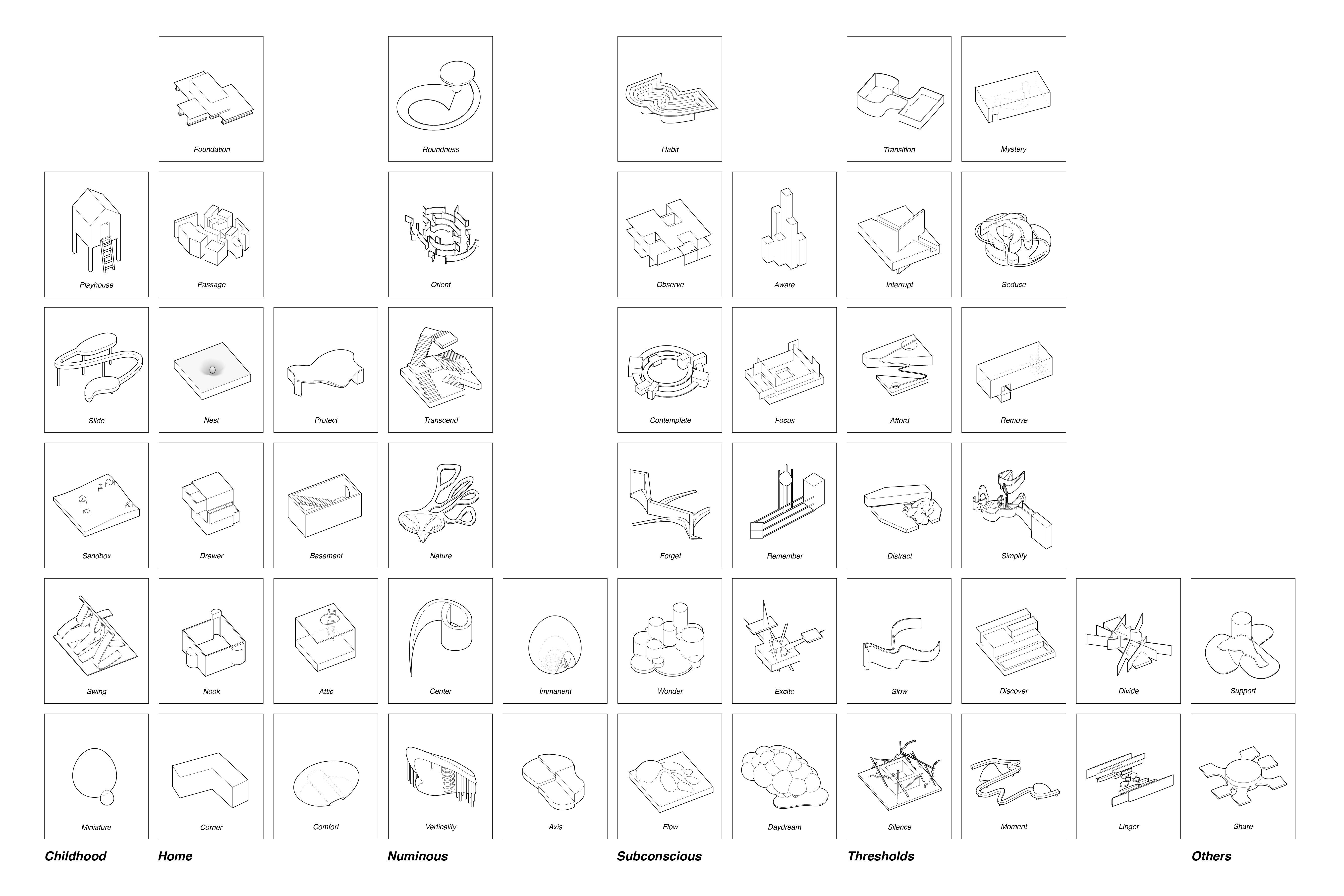 A series of 100 diagrams that are based on intuitive words that are derived from the desired sensations and features of the space.