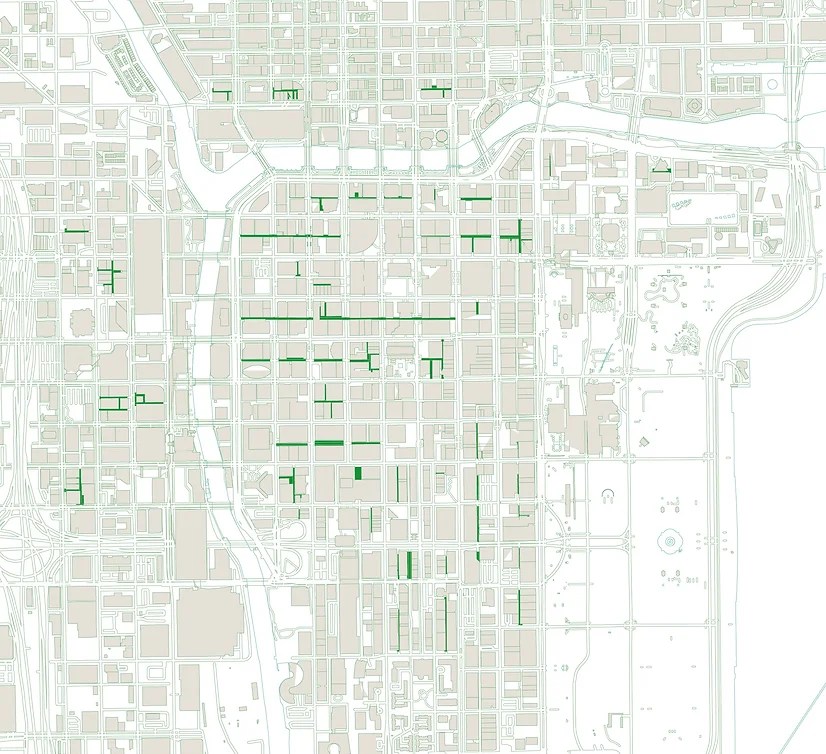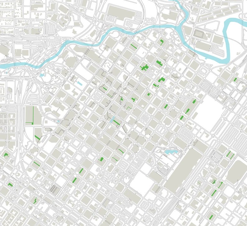 Site maps highlighting the interstitial spaces (shown in green) within Chicago (left) and Houston (right), two of the most productive and busy cities in the United States. Houston would be later chosen as the site for intervention due to its historical pedestrian unfriendliness and lack of developmental empathy.