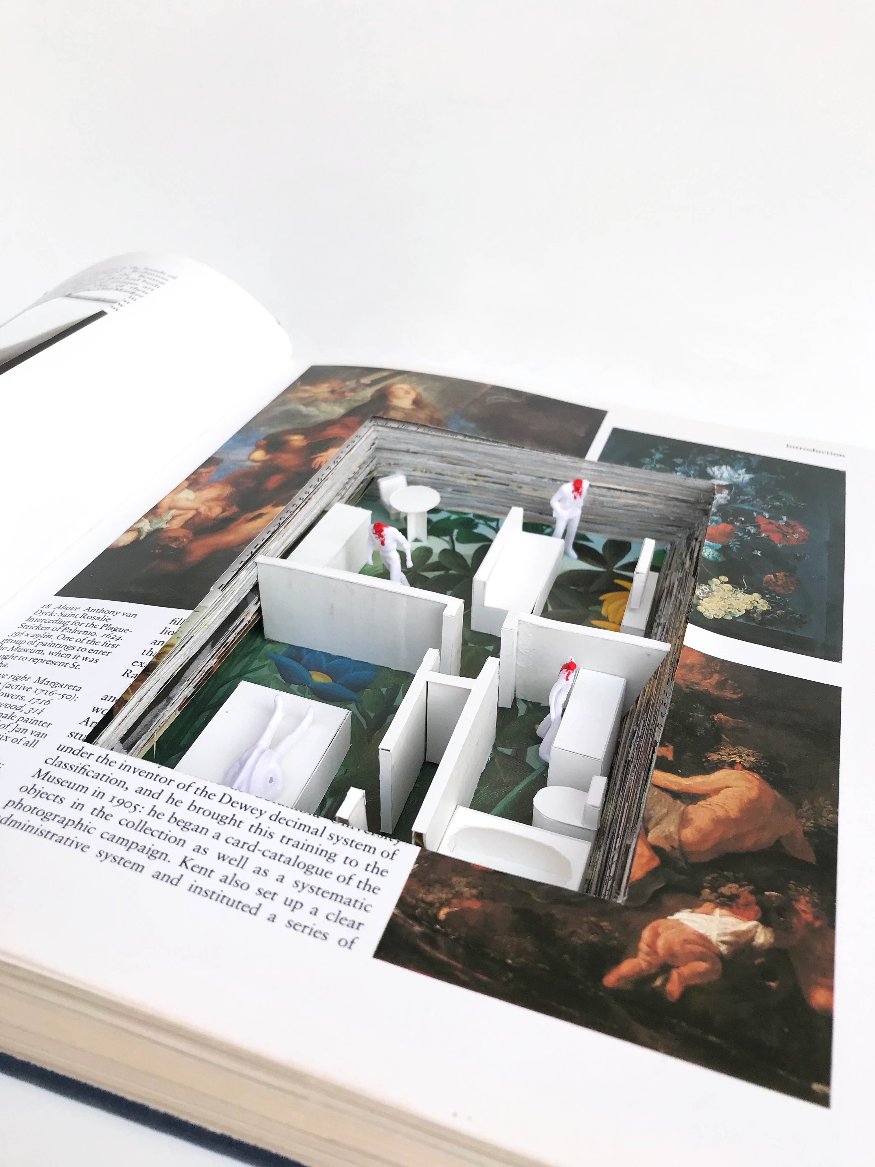 In an initial attempt to abstractionally symbolize the change in Western architectural epistemology from metaphysicality and intangibility to physicality and empiricism, this artifact was created. A book has been cut open in order to fit a three-dimensional, functional floor plan of a typical single home. However, everyone’s heads have been cut off. The use of the architecture without the head represents how modern architecture is only used as a function for our bodies and not our minds.