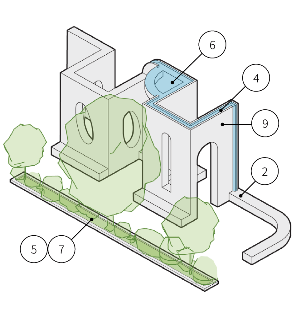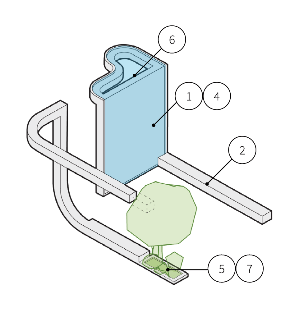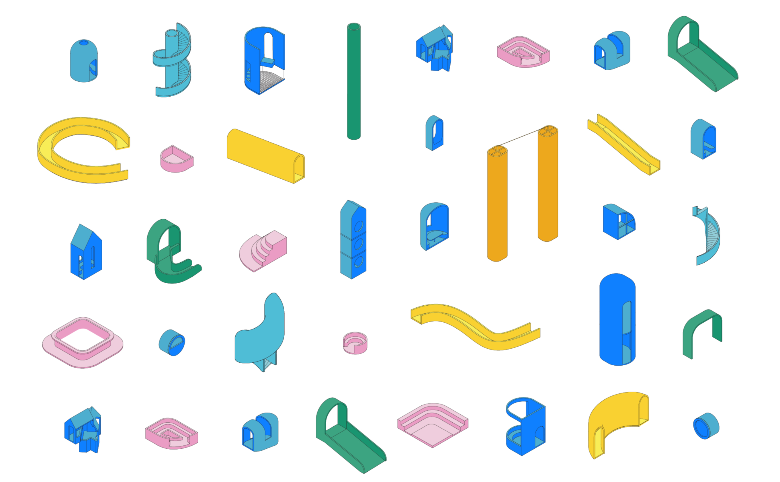 A final kit of programs that can be chosen from and placed in any order within any interstitial space to create the park. Final design was based on incorporating the necessary physical attributes, concept attributes, and formal intuitions. Numbers are based on desired design features listed earlier.