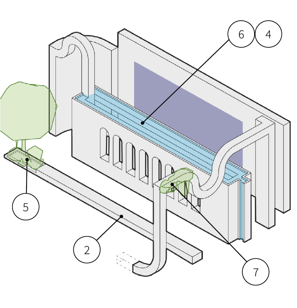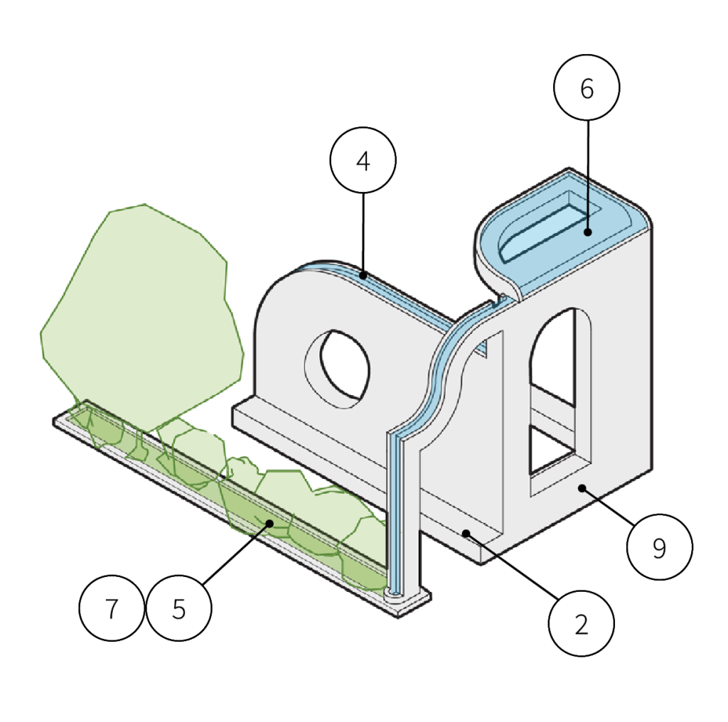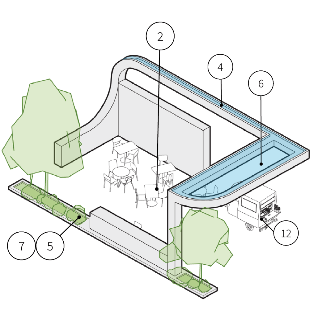 A final kit of programs that can be chosen from and placed in any order within any interstitial space to create the park. Final design was based on incorporating the necessary physical attributes, concept attributes, and formal intuitions. Numbers are based on desired design features listed earlier.