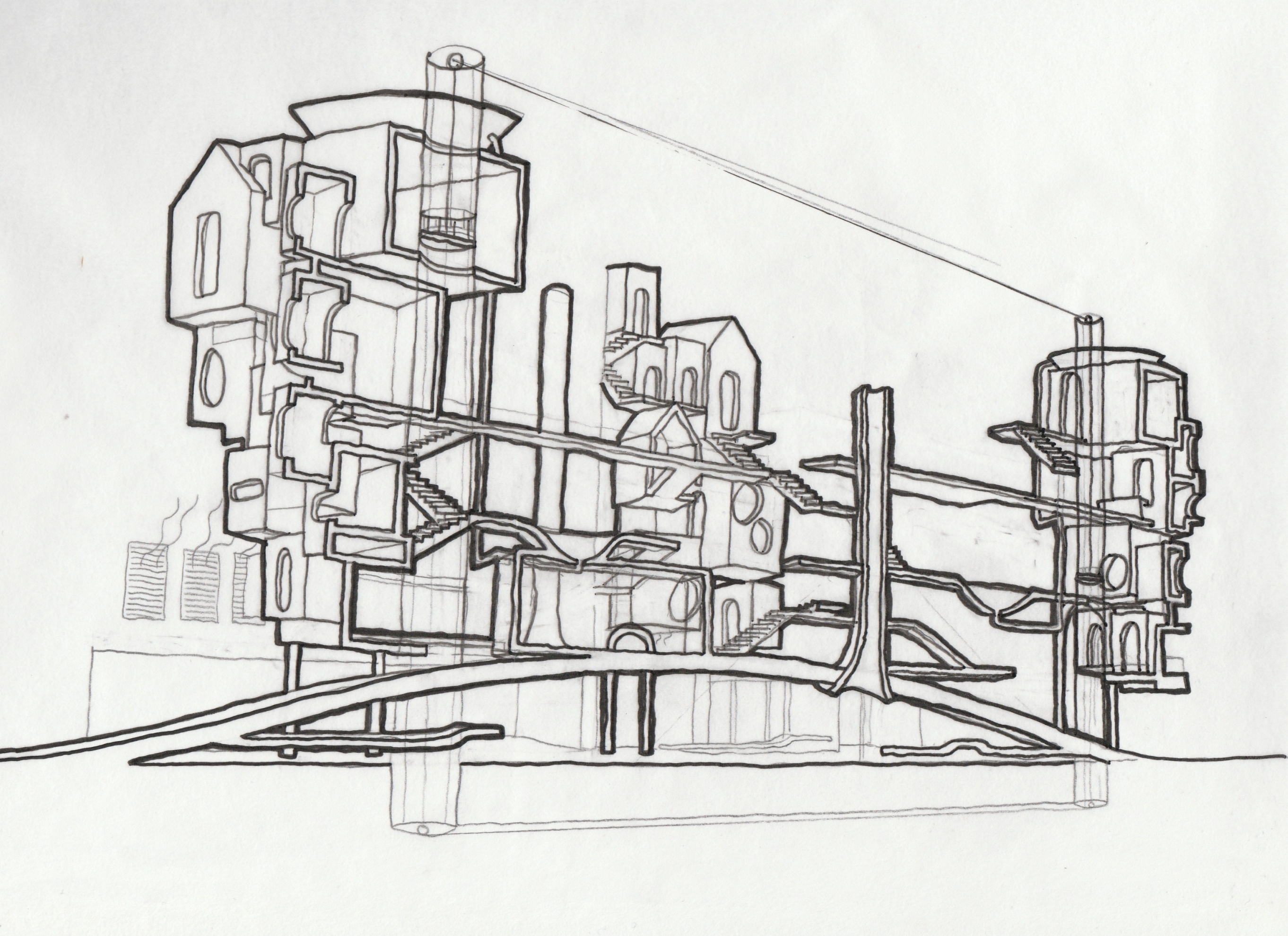 Two section explorations that combine the previous clusters and formal intuitions into one larger scheme. Created on trace paper with ink and Photoshop.